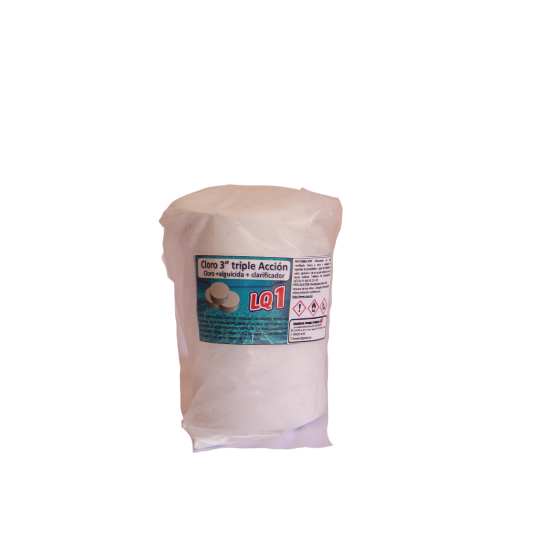 Formulado como clorador, alguicida, floculante, estabilizante y antisarro para aguas de piscinas, su lenta disolución se debe a su presentación en tabletas, el alguicida es a base de sulfato de cobre, el clarificador a base de sulfato de aluminio. Antes de aplicar el pH del agua debe estar entre 7.2 y 7.6 y el nivel del cloro libre se debe mantener entre 1 y 3 ppm, luego debe colocar la tableta de Cloro Triple Acción en un dosificador, skimmer o flotador y dejarlo en el agua de la piscina. Se recomienda mantener el filtro en operación y no se debe aplicar en forma directa al agua.